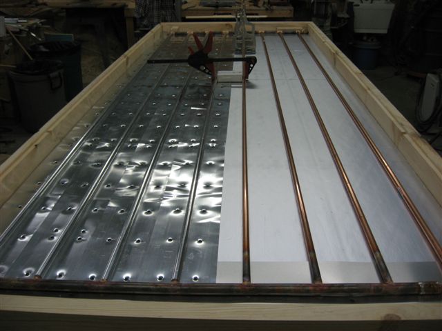 Having experimented with 12 or more panels before starting my own system; I had developed a design that worked the best for my application. Knowing the backside of my collectors would be exposed to the elements (weather and creatures), I needed the back of them to be a solid board. I used 2×6’s for the side and bottom frames, insetting the ¾” OSB by 1” so the edges would not be exposed to the weather. I placed 1” Styro (the high temp variety) inside the collector on top of the OSB. I like the Styro (actually Polyiso) as the last material before the absorber and tubing, as it insulates the heat collection area from rest of the collector. With ¾” of board, and 1” of Styro, 1 5/8” drywall screws were the perfect length for attaching my absorber tightly to the panel. I used my “Vice Grip” tools to squeeze the absorber tightly to the copper before installing the screws. I found, when properly tightened, the screws were very effective in holding the aluminum tightly to the copper risers. My pre-pressed absorbers help with the fit as well, requiring significant force to “snap” on the copper.