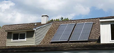 Knick Knickerbocker’s nicely built solar collectors. Another system with twin wall polycarbonate. Note the professional installation on the side of the house, located near Grand Rapids, MI. Knick has most his plumbing done, heat exchanger in, but he’s still working on a pump before going live.