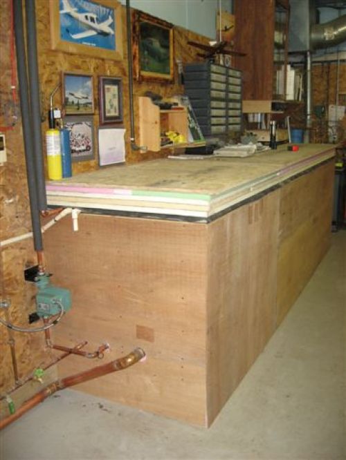 I built a storage tank using Gary’s design of wood and pool tank liner. The area I planned to place the tank was in my workshop of my heated underground garage, and I wanted the tank to serve as a work bench as well. The initial plan for my tank would have worked well for a work bench, but after incorporating my wood boiler into the system, the tank ended up a little taller than a normal workbench (for gravity water level balance, to be explained later). The tank is made with 2×4’s and ¾” OSB, and is 3’ wide and 12’ long. I have at least 4” of Styrofoam insulation on all sides of the tank. Two aluminum straps were placed at 4’ intervals across the long distance of the tank for side pressure of the water over this distance. These served well to hang the heat exchanger for my Domestic Hot Water (DMH), which I wanted close to the top of the tank for the highest water temperature.